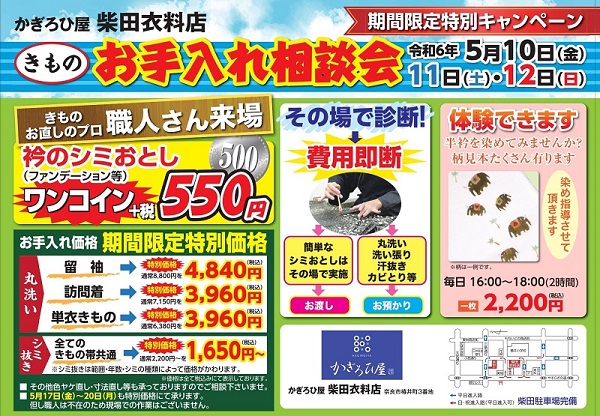 2024.04.27 令和6年「きもの・お手入れ相談会」 5月10日(金)・11日(土)・12日(日) ❀✿❀会場のご案内❀✿❀ かぎろひ屋 柴田衣料店 〒630‐8343 奈良市椿井町3番地(椿井小学校前) 【営業時間】10:00~19:00(火曜日定休日) 【電話番号】0742-20-2222(代)