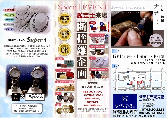 2024.11.29 JEWELRY COLLECTION JEWELRY COLLECTION 12月14日(土)~ 12月16日(月) かぎろひ屋 柴田衣料店2階 ❀✿❀会場のご案内❀✿❀ かぎろひ屋 柴田衣料店 〒630‐8343 奈良市椿井町3番地(椿井小学校前) 【営業時間】10:00~19:00(火曜日定休日) 【電話番号】0742-20-2222(代)
